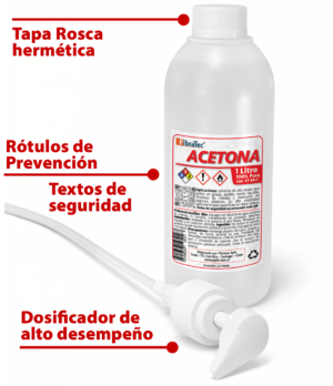 Envase de 1 Litro de Alta Calidad y Rotulado: Nuestro envase ha sido seleccionado pensando en la comodidad del usuario y en mantener la integridad de la acetona. Su capacidad de 5 litros es ideal para trabajos que requieren una cantidad significativa del solvente sin la necesidad de reposiciones frecuentes.